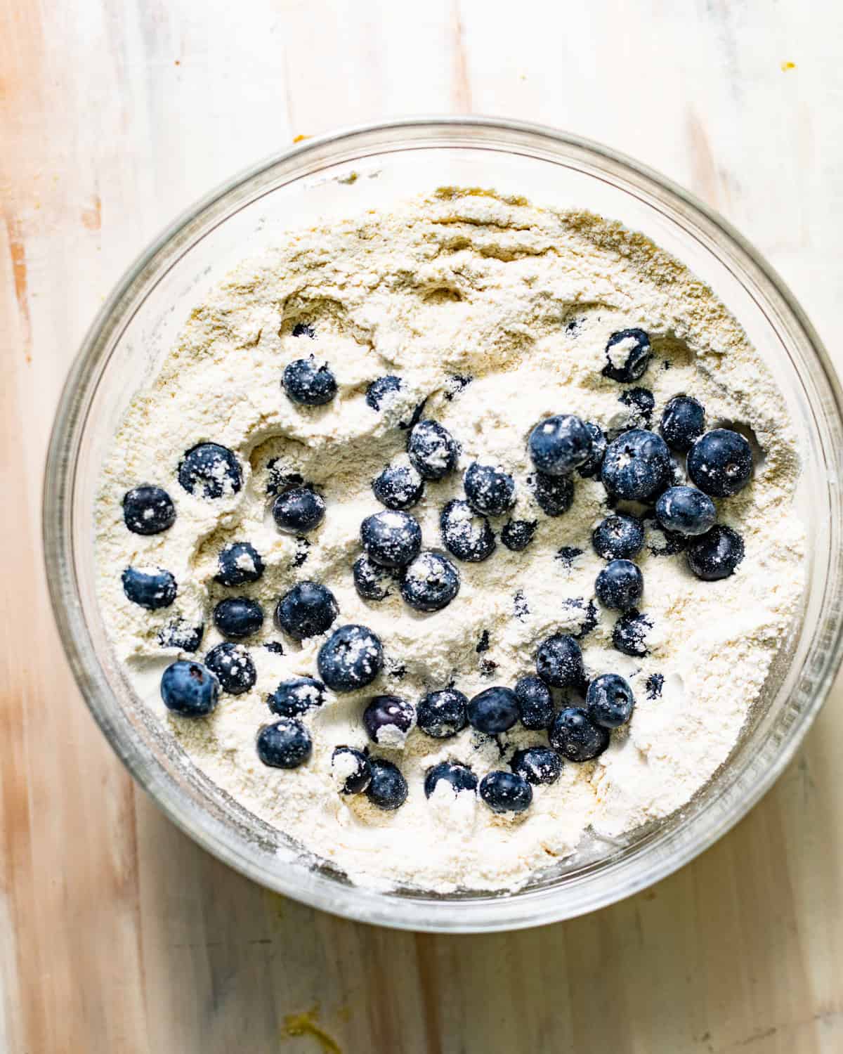 Step 1: Add dry ingredients to a medium bowl – all purpose flour, cornmeal, leaveners, salt, and nutmeg. Whisk together and add blueberries – toss to coat.